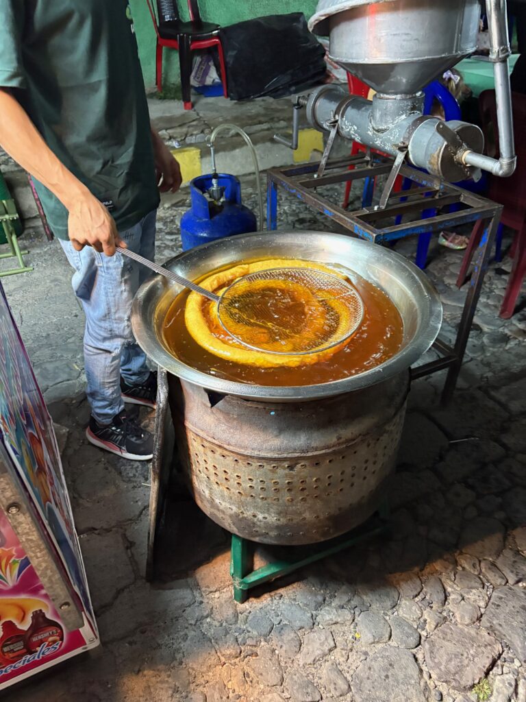 Churro being deep fried. This tastes great with powdered sugar.