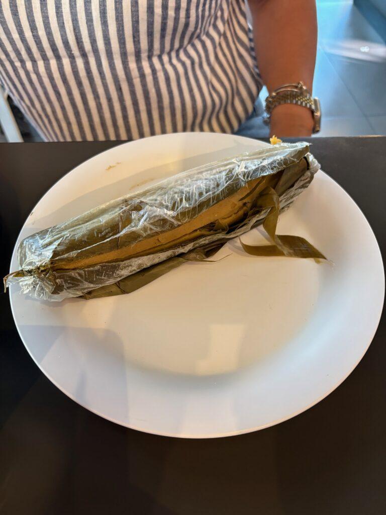 Chicken tamal wrapped in banana leaf
